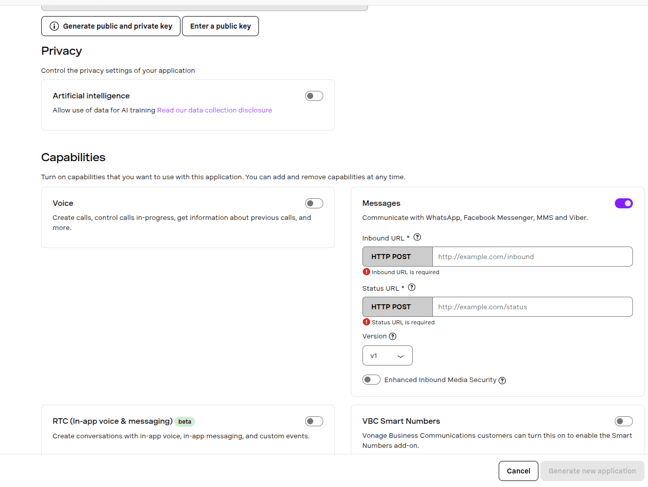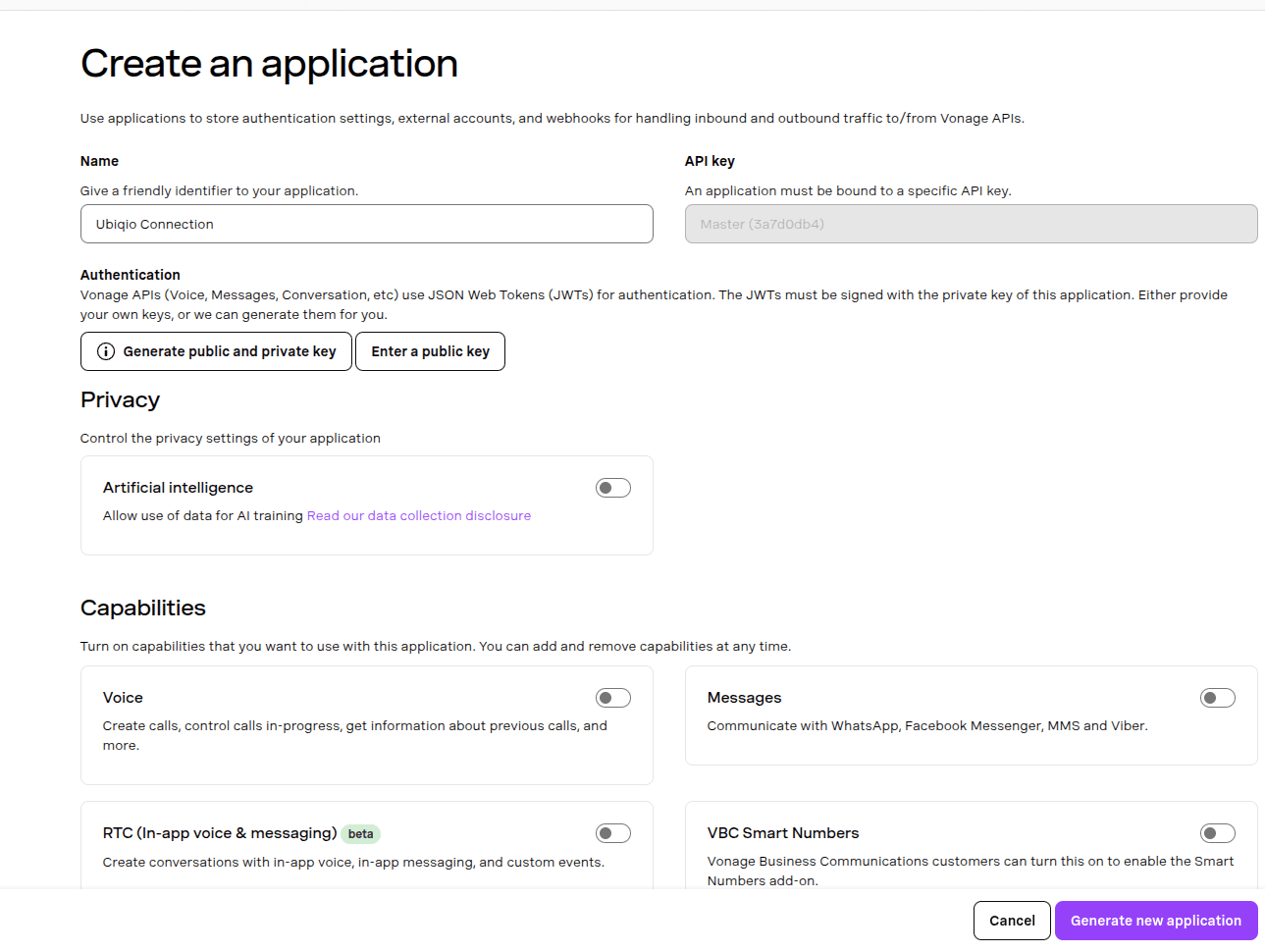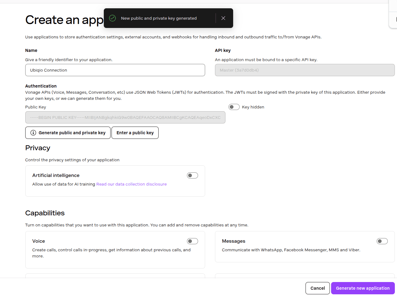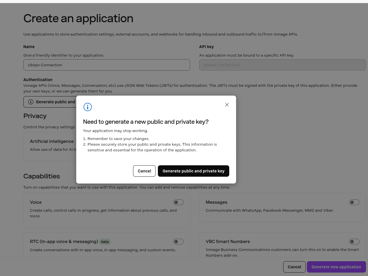 Ubiqio and Vonage handle authentication via public and private keys. Click on “Generate public and private key” to create a new key pair.