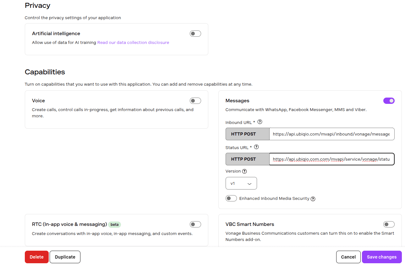 These URLs allow Vonage to communicate with Ubiqio and route messages seamlessly to your application.